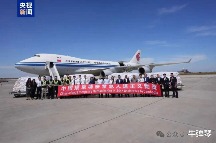 同一天,一架国航飞机抵达柬埔寨。这是中国政府向柬埔寨提供的首批紧急人道主义援助物资,包括帐篷、毛毯、食品等。