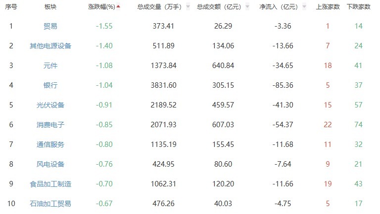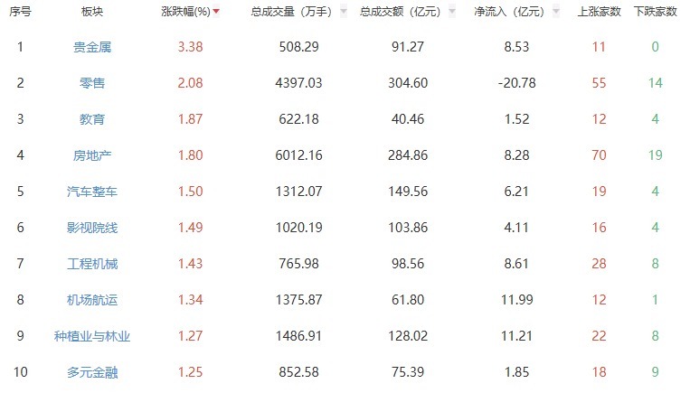 板块方面,贵金属、零售、教育等板块涨幅居前,贸易、其他电源设备、元件等板块跌幅居前。